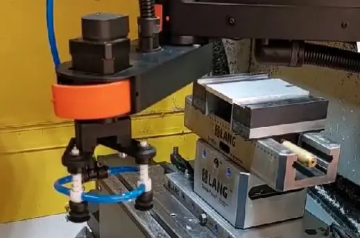 In this application at igus GmbH in-house, it is a loading robot. The Scara robot brings plastic parts into the installation space of the Fanul Robodrill. These are then processed there and the robot sorts them out again.